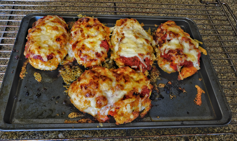 - Assembly: Place the fried chicken in the prepared baking dish, and spoon marinara sauce over each piece. Sprinkle with mozzarella and Parmesan cheese.