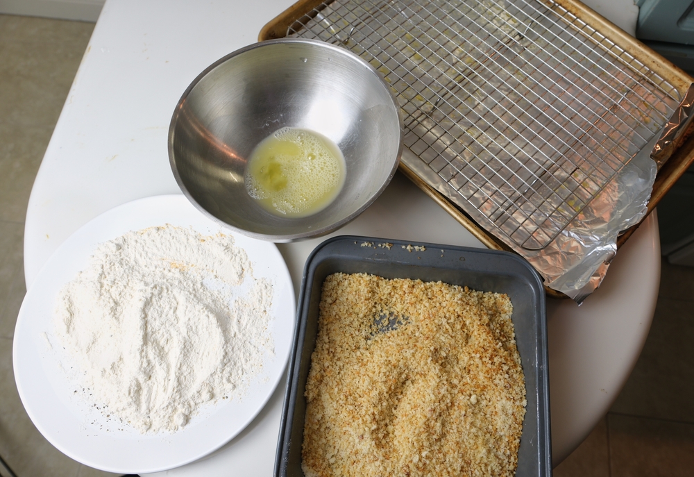 - Breading: Dredge the chicken breasts in flour, then dip them in beaten eggs, and finally coat them with bread crumbs. Season with salt and pepper.